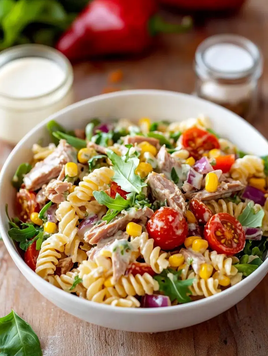Mi colorida ensalada de pasta con atún alegra cualquier mesa. La mezcla de maíz, pimientos y el ligero aderezo de yogur la convierte en la compañera perfecta para cada ocasión. Un plato rápido que te deja satisfecho y contento.
