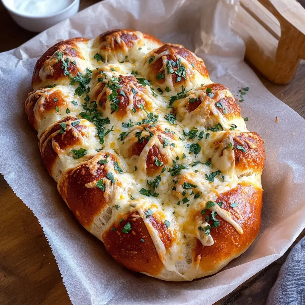Un divertido aperitivo con pan relleno de queso, dispuesto en forma de balón y cubierto con mantequilla de ajo y hierbas. Perfecto para días de juego.